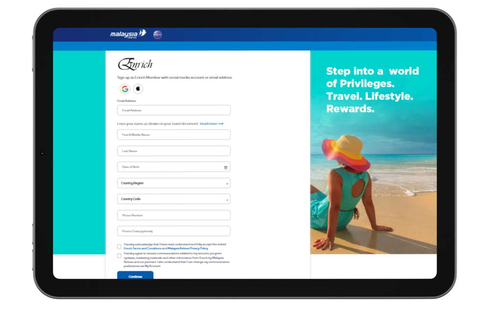 If you don’t already have a Malaysia Airlines Enrich account, sign up for free.